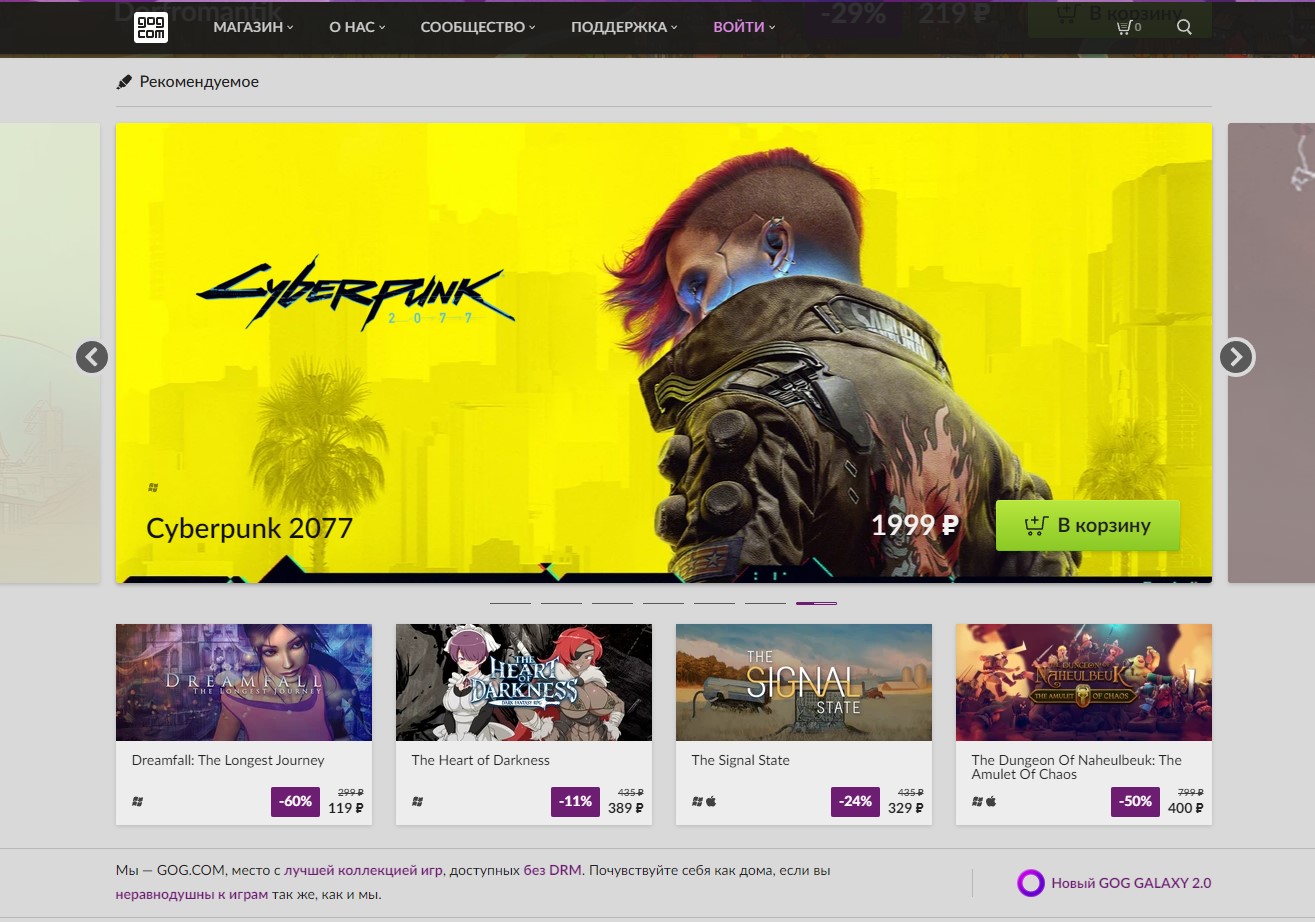 Другое достоинство GOG заключается в отсутствии DRM-защиты. В отличие от подавляющего большинства других цифровых площадок, здесь вы действительно приобретаете дистрибутив игр. После загрузки через клиент GOG Galaxy их можно запускать где угодно, как угодно и сколько угодно — постоянное подключение к сети не требуется, строгой привязки к учетной записи тоже нет. Можно даже скачать игры на аккаунте товарища и пользоваться ими на собственном. Отдельная функция GOG Connect также позволяет подцепить к GOG вашу учетную запись Steam и получить копии приобретенных там игр без DRM. Не всех, конечно, но бонус все равно приятный.