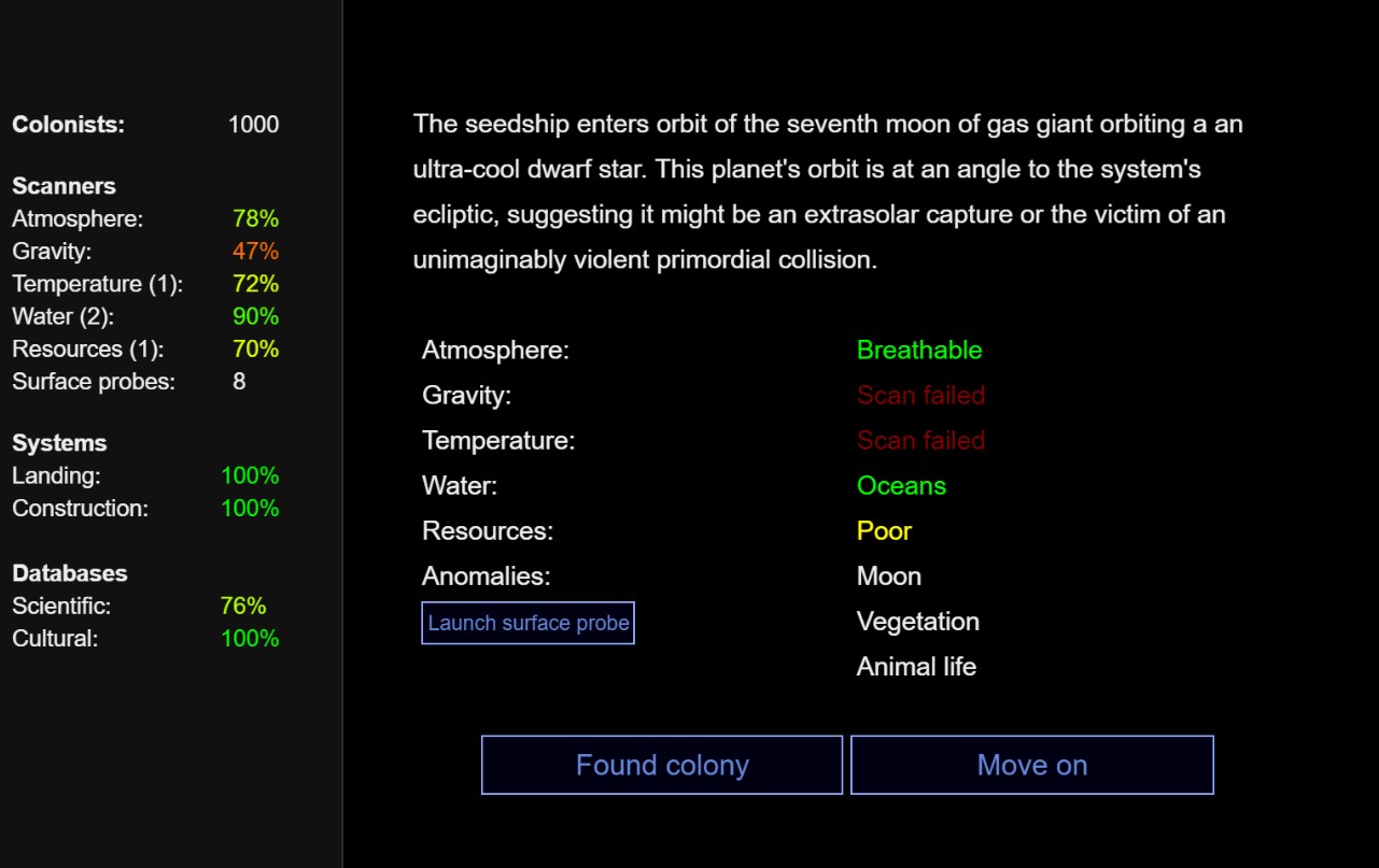 Процедурно-генерируемое текстовое приключение, где игроку предстоит взять на себя роль ИИ космического корабля, перевозящего спящих колонистов в поисках нового дома. Во время путешествия придется совершать немало непростых решений, следить за состоянием людей и корабля, а также внимательно исследовать неизвестные планеты. Seedship совершенно бесплатна, но, к сожалению, не переведена на русский язык — читать придется строго на английском.