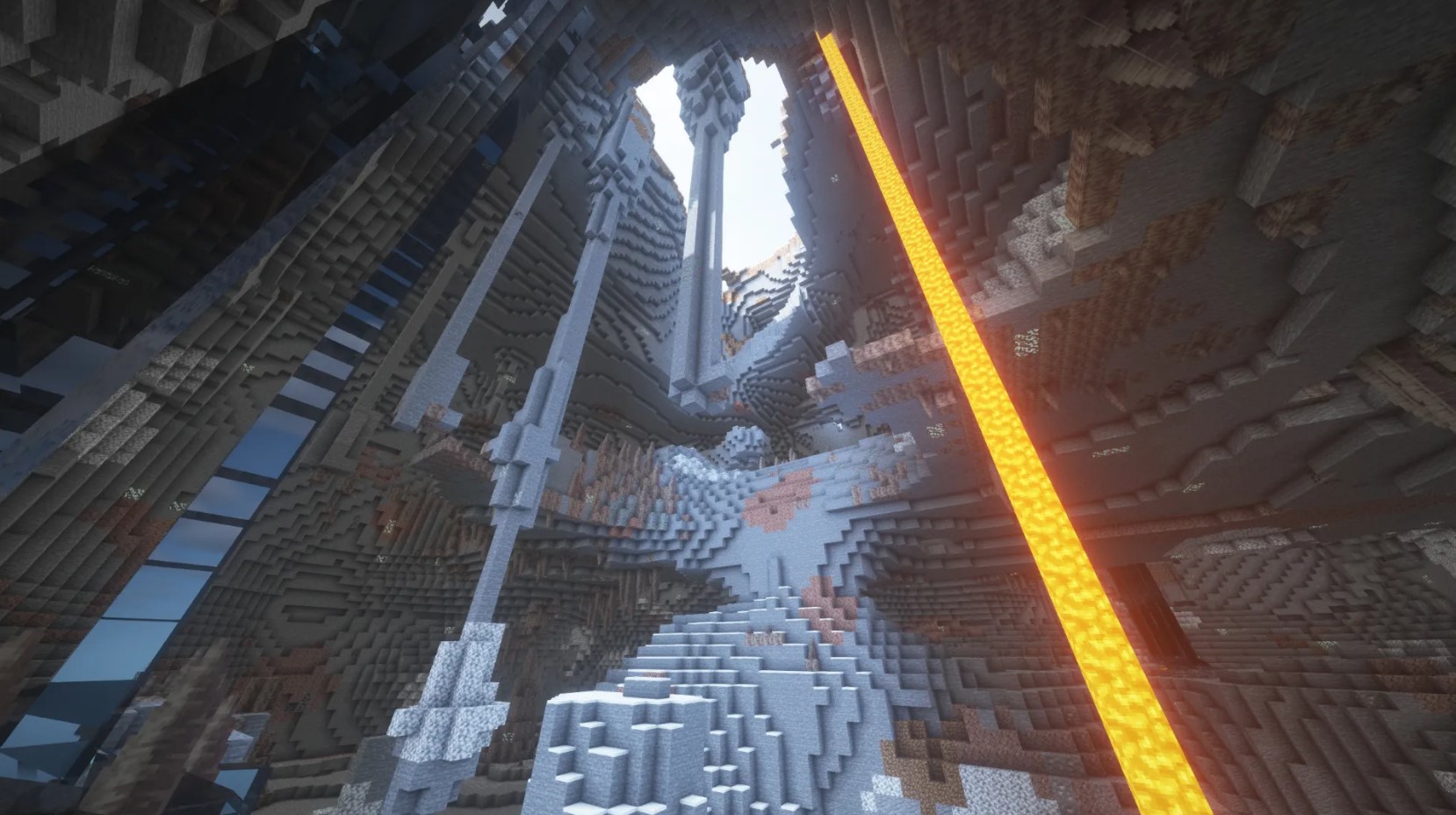 Поклонникам горных пейзажей рекомендуется. От стартовой точки идите вдоль полосы снега — рано или поздно вы набредете на череду горных пиков, которые постепенно становятся все выше и выше. А справа от спауна можно найти огромную систему пещер, которая спускается прямо до основания мира.
