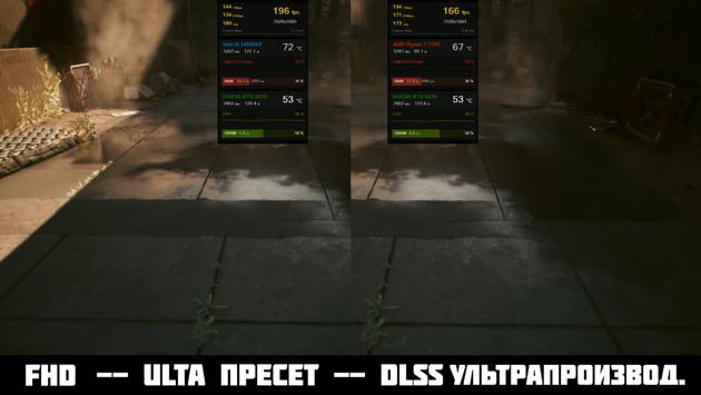 В игре Alan Wake II в 1080р с пресетом Ultra и DLSS "ультрапроизводительность" удалось в среднем получить с 14600KF на 20% больше FPS, чем с 7700. В QHD с ультра-графикой результат одинаковый, а при включении DLSS снова Intel оказывается лучше примерно на 20 к/с.