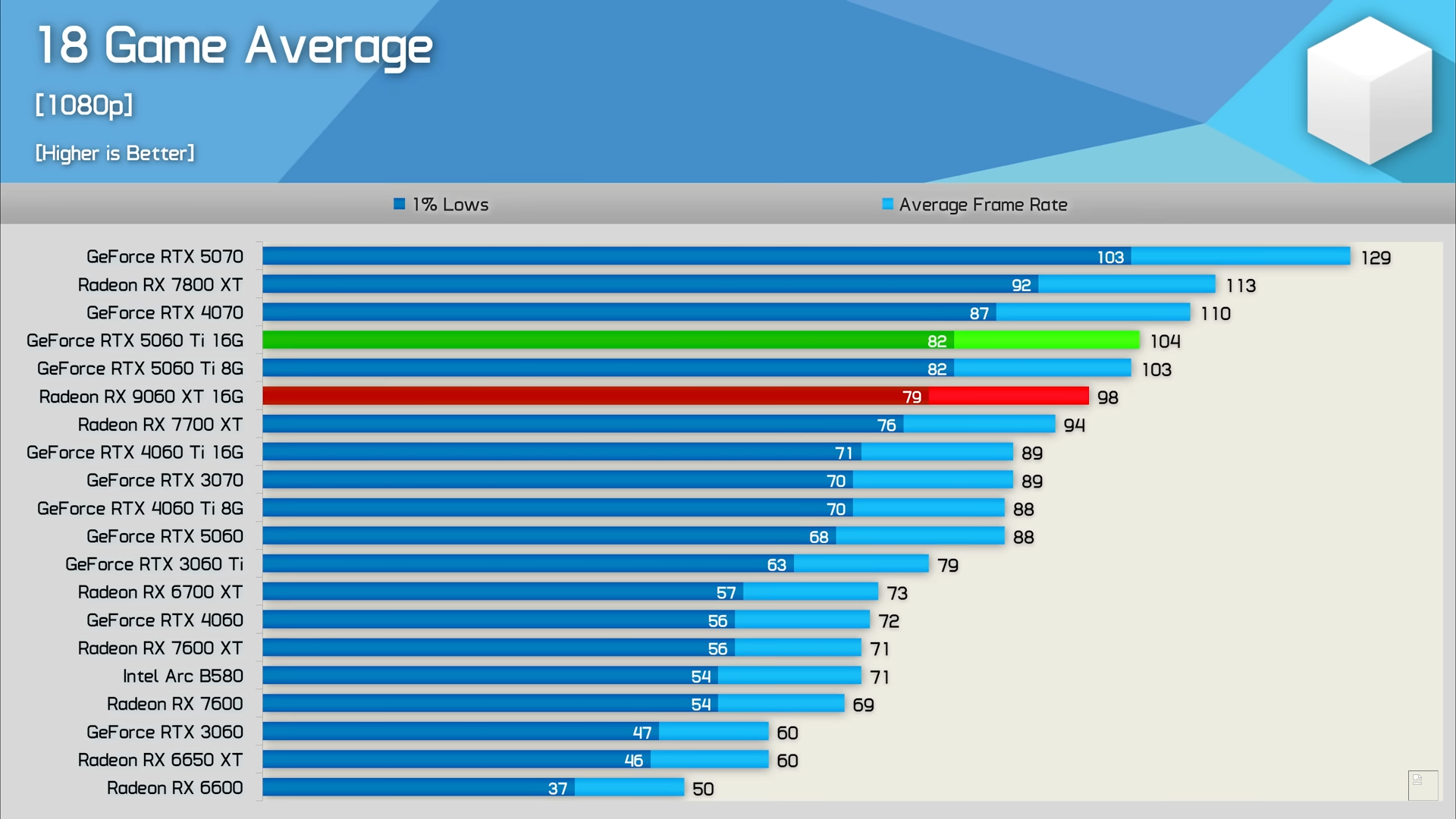 В FullHD-разрешении в проектах с классической растеризацией карта оказалась в среднем на 6% медленнее NVIDIA RTX 5060 Ti 16 ГБ, но на 4% опередила RX 7700 XT. В 1440p отставание от 5060 Ti сократилось до 1%, а преимущество над 7700 XT осталось тем же.