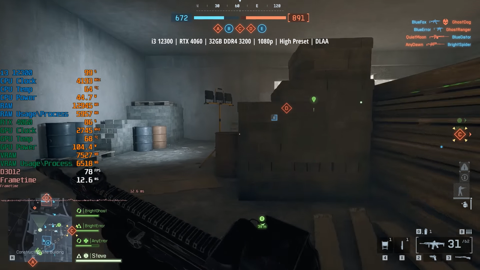 Тестовый стенд включал процессор Intel Core i3-12300/Pentium Gold G7400, видеокарту RTX 4060, оперативную память 32 ГБ DDR4 3200. Игра Battlefield 6 запускалась в 1080р и 1440р с высоким пресетом, DLAA.