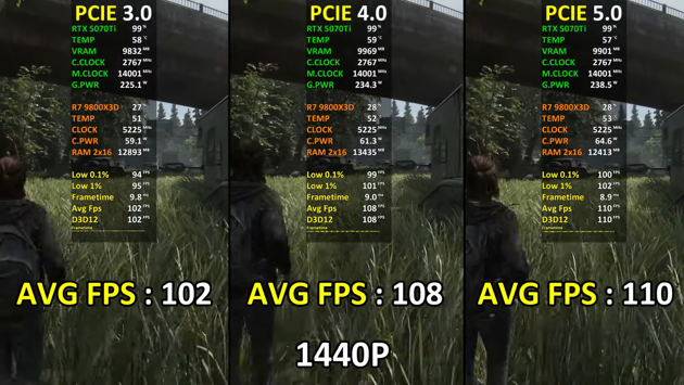 В The Last of Us Part 2 с графикой Very High средняя частота кадров составляла 102 к/с (PCIe 3.0), 108 к/с (PCIe 4.0) и 110 к/с (PCIe 5.0).