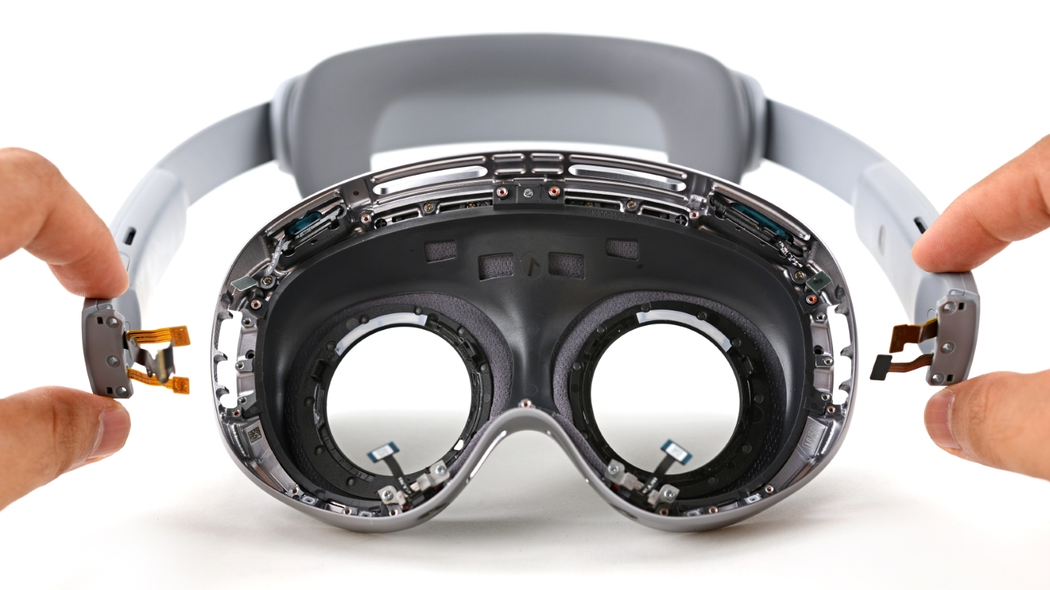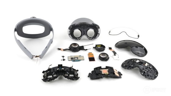 Камеры и датчики собраны в отдельный модуль, что облегчает доступ к основной электронике. Материнская плата и система охлаждения тоже относительно удобны для ремонта. Особенно экспертов порадовало, что дорогие экраны micro-OLED крепятся на винтах, без клея.