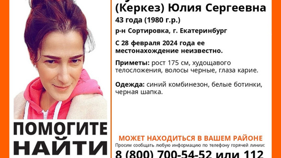 «Помогите найти человека! Пропала Куликова (Керкез) Юлия Сергеевна, 43 года, район Сортировка, город Екатеринбург. С 28 февраля 2024 года ее местонахождение неизвестно. Может находиться в вашем районе», — написали в группе «ЛизаАлерт» «ВКонтакте».