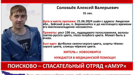 Просим оказать содействие в поиске Соловьёва Алексея, жителя города Новосибирска. Алексей направился в Амурскую область на работу, но до нужной станции не доехал в связи с ухудшением здоровья. 21 июня 2024 г. Алексея видели лежащим у дороги на подъезде к посёлку Верхнезейский, далее его местонахождение неизвестно, - говорят поисковики.