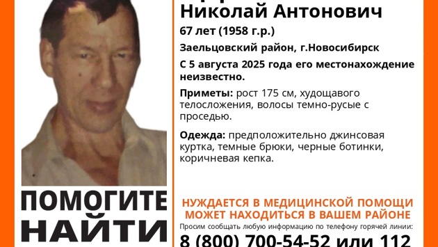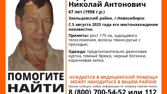 В Заельцовском районе Новосибирска без вести пропал 67-летний Николай Щербин. Как сообщили в поисково-спасательном отряде (ПСО) «ЛизаАлерт», с 5 августа 2025 года его местонахождение неизвестно, поэтому к поискам подключились волонтеры.