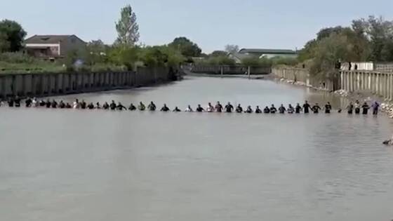 На кадрах видно порядка полсотни россиян, прочесывающих реку. Цепь растянулась поперек всего русла Терека.