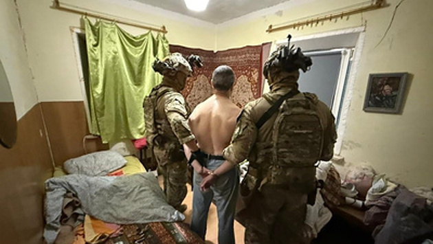 На снимках в Telegram-канале полиции видно, как подозреваемый стоит в наручниках, рядом с ним находятся сотрудники полиции и Службы безопасности Украины.