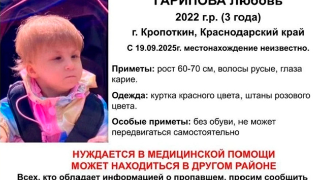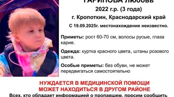 В Краснодарском крае ищут пропавшую трехлетнюю девочку с ДЦП