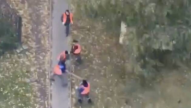 На представленных кадрах видно, как работники стоят между деревьями и наносят друг другу удары.