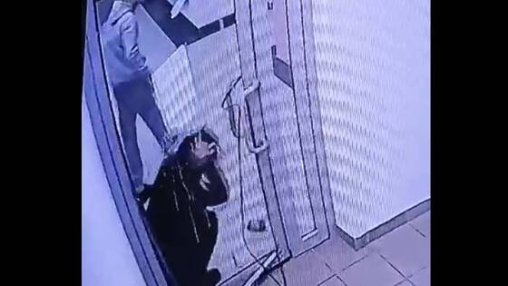 На кадрах видно, как агрессор хватает жертву за одежду, трясет и пробивает ее головой дверь, нижняя часть остекления которой вылетает из рамы. После этого мужчина рывком поднимает девушку и уводит в сторону выхода.