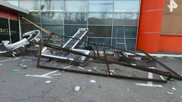 Инцидент произошел в темное время суток. Огромная рекламная конструкция, которая находилась на крыше торгового центра на высоте около 20 метров, упала вниз — ее сорвало с места порывом ветра.