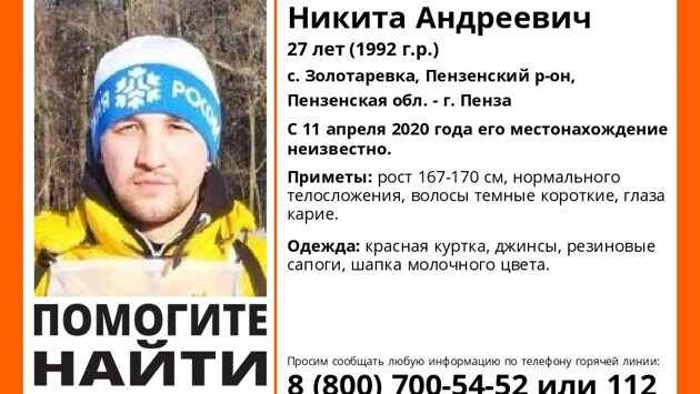 Жителей Пензы и области просят помочь в поисках 27-летнего Никиты Антипова, пропавшего 11 апреля. Информация об этом размещена в официальной группе поискового отряда «Лиза Алерт» в соцсети «ВКонтакте». Приметы: рост 167 — 170 см, нормальное телосложение, темные короткие волосы, карие глаза. Был одет в красную куртку, джинсы, на ногах — резиновые сапоги, на голове -шапка молочного цвета. Фотография: vk.com/la_penza