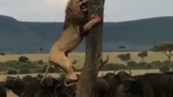 Лев испугался стада разъяренных буйволов и залез на дерево