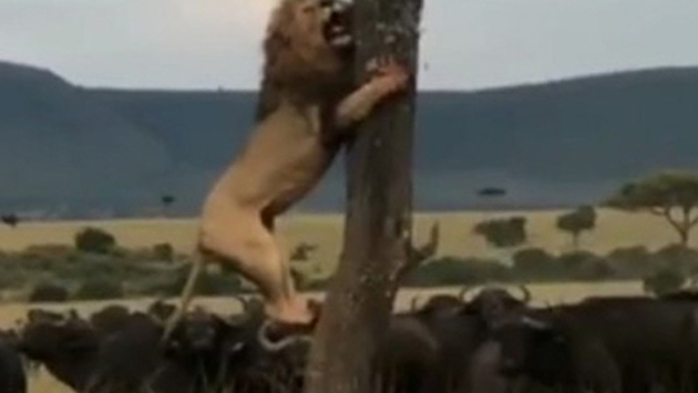 На записи видно, как лев пытается залезть на дерево, чтобы спастись от разъяренных буйволов. Стадо животных бродит позади дерева и отказывается уходить. Уставший лев начинает соскальзывать по коре. На этом видео обрывается.