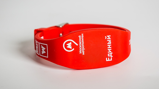 Браслеты красного цвета сделаны из силикона. На них изображен логотип московского метро, а также есть надпись «Единый» и указано количество записанных поездок. Размер браслета можно отрегулировать.