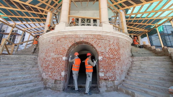 Также ведется расчистка поздних красочных слоев фасада, восстановление основания полуротонды-террасы и ступеней огибающих её лестниц. С колоннады специалисты удаляют грибок и плесень, начались работы и на гипсовых капителях колонн, на верхах которых есть декор в виде акантовых листьев. Уже полностью заменена старая обрешетка кровли. Она закрыта от дождей брезентом. Сейчас ведутся подготовительные работы к монтажу нового покрытия из меди в виде шашечек, похожих на черепицу.
