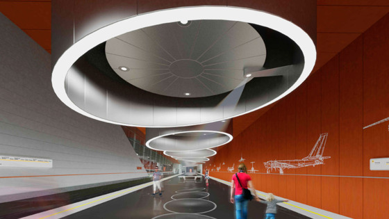 «Другим «авиационным» элементом оформления станции являются потолочные световые конструкции в виде самолетных турбин. Первая из них уже обрела окончательный облик - на каркасе завершен монтаж светового оборудования и декоративных алюминиевых панелей. Устройство еще девяти «турбин» продолжается», - добавил Бочкарев.