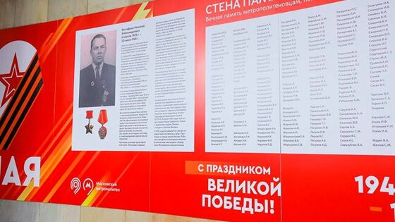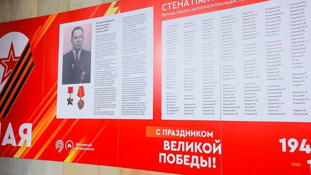 "Стены памяти" в честь метрополитеновцев-фронтовиков появились на "Маяковской" и "Курской", а потолочный свод "Трубной" украсили 25 георгиевскими лентами и 50 бантами. Об этом сообщает пресс-служба столичного Дептранса. "Мы помним героев Московского транспорта. С гордостью представляем пассажирам имена, фотографии и истории участников Великой Отечественной войны, которые не только стояли у истоков метрополитена, но и внесли свой вклад в Победу. Приглашаем вас вместе с нами почтить память тех, кто отдал жизнь, чтобы защитить Родину", – сказал Ликсутов. Так, на стене в аванзале "Курской" представили историю подвига Александра Евстафьева, который нашел лодку и выполнил боевое задание под вражеским обстрелом. Евстафьев работал слесарем-обходчиком в электродепо "Северное", участвовал в битве за Сталинград и прошел всю войну. В целом на стене появились имена 226 сотрудников Московского метрополитена, которые погибли на фронте. Ранее у 11 станций метро к 9 мая установили инсталляции в виде звезд. Они появились вблизи "Сухаревской", "Площади Революции", "Смоленской", "Проспекта Мира", "Улицы 1905 года", "Таганской", "Трубной", "Баррикадной", "Октябрьской", "Маяковской" и "Чистых прудов". До этого заммэра Москвы Петр Бирюков рассказал, что в столице установили более 4 тысяч декоративных элементов ко Дню Победы. Основным цветом для оформления города, по его словам, стал цвет знамени Победы – красный. Так, на въездах в столицу установили декоративные сооружения в честь праздника и города-героя, а у станций метрополитена, на вокзалах, набережных и в других местах – флаги.