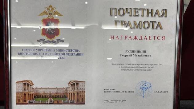 ГУ МВД России по Москве наградило почетной грамотой за активное содействие органам внутренних дел генерального директора акционерного общества «Редакция газеты «Вечерняя Москва» Георгия Рудницкого. Награждение состоялось во время заседания общественного совета ГУ МВД России.