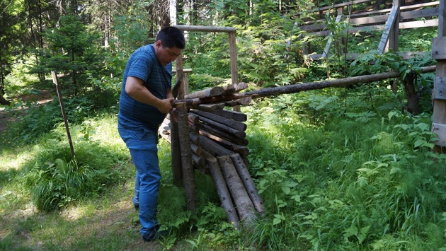 Как охотиться без оружия и капканов? Это с давних времен умеют аборигены Югры – ханты и манси. Их охотничий опыт наглядно представлен в одной из самых интересных наглядных музейных экспозиций Ханты-Мансийска – на охотничьей тропе. А находится эта тропа на территории этнографического музея под открытым небом «Торум Маа». Музей — хоть и в городской черте, но в самой настоящей тайге, на священном холме северян: «Торум Маа» означает «Земля Торума», верховного божества хантыйского и мансийского пантеона. Зайдя на эту зеленую — а зимой бело-зеленую — территорию, гость может ознакомиться с бытом, обычаями, традициями и ремеслами аборигенов, зайти в традиционный бревенчатый дом и в берестяной чум, продегустировать хлеб из хантыйской печи и суп-шурпу, сваренную из оленины, повязать лоскуток ткани на дерево, обратившись за помощью к духам. А еще пройти по охотничьей тропе. Показать секреты мастерства охотников может сотрудник музея, заведующий сектором музейных программ и проектов Вячеслав Кондин. Он коренной югорчанин, в его роду – и ханты, и манси, так что Вячеслав Юрьевич не понаслышке знает то, о чем рассказывает посетителям. «История нашей тропы началась в 2006 году, с семинара музейных работников по созданию таких экспозиций. С тех пор работа ведется постоянно, в прошлом году проведен очередной семинар, сделано несколько новых демонстрационных ловушек, — говорит Вячеслав. – Их требуется не только строить, но и ремонтировать, подновлять – в этом нам помогают старшеклассники из Школы выживания, так что многие из этих ребят сами могут смастерить настоящую ловушку на зверя. В советское время ловушки были запрещены, охотились железом – оружием, капканами. Но теперь наоборот, запрещены капканы, а ловушки легализованы. Причина возврата к традициям в том, что капканы калечат зверей, делают инвалидами. Сегодня ряд животных югорские охотники добываю только такими старинными способами – например, соболя. Но конечно, и при традиционной ловушке нужна охотничья лицензия». Здесь стоит отметить, что не каждый посетитель спокойно воспринимает рассказ – сегодня немало противников жестокого обращения с животными, кого печалят такие подробности. Однако Вячеслав Кондин возражает: ловля ловушками, когда охотник один на один со зверем в любом случае гуманнее, чем установка калечащих животных капканов, когда звери вынуждены отгрызать себе лапы, или массовой охоты с ружьями на автомобилях, с вертолетов… Если кому-то из читателей рассказ доставляет неприятные ощущения – просим закрыть эту страницу. С остальными — продолжаем! Начинается тропа с ловушек на боровую дичь. Устройства из палок и бревнышек, которые позволяют добывать зверей и птиц за счет придавливания их грузом, имеют общее старинное русское название «слопец». А делают его ханты и манси на разных территориях по-разному, и называют тоже. «Няль (мансийское название) – кондинский слопец. Ставят его в сосновых борах. Ловушка настораживается так, чтобы висячая конструкция при потере равновесия задавила дичь. Глухари принадлежат к отряду куриных, чтобы переваривать грубую пищу, хвою, они набивает зоб песком, галечником, чтобы пища перетиралась. Вот и в ловушку кладут песок, гальку, чтобы птица потянулась за ними, а для приманки – что-то вкусное: ягоды, почки. Глухарь заходит внутрь, выбив