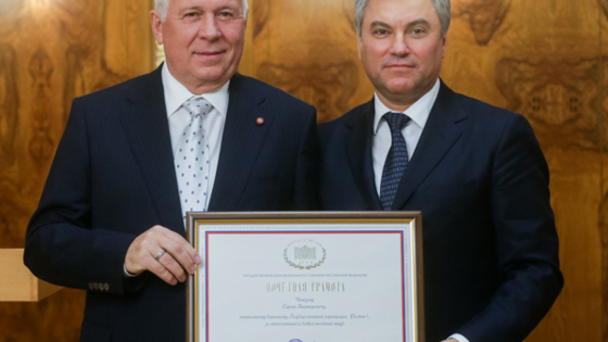 Сегодня состоялась встреча руководства Госкорпорации Ростех во главе с генеральным директором Сергеем Чемезовым с Председателем Государственной Думы Вячеславом Володиным. Встреча была организована в честь десятилетия с момента образования Госкорпорации. Вячеслав Володин наградил специалистов Ростеха почетными грамотами Государственной Думы и поблагодарил Сергея Чемезова за активную работу Ростеха с Государственной Думой. «Хотел бы отметить важность участия сотрудников корпорации в качестве экспертов Государственной Думы по вопросам законотворчества. Наша совместная работа делает этот процесс более эффективным. Люди – самый ценный актив компании. Это уникальные специалисты, которые создают высокотехнологичную продукцию, пользующуюся спросом во всех странах. Корпорация уделяет большое внимание цифровой экономике, развивает наукоемкие отрасли и является ведущим поставщиком современного вооружения», – приводятся слова Вячеслава Володина на официальном сайте Госдумы. Помимо Сергея Чемезова, почетных наград были удостоены первый заместитель генерального директора Госкорпорации Владимир Артяков, заместитель генерального директора по финансовым вопросам Игорь Завьялов, главный бухгалтер Госкорпорации Наталья Борисова, исполнительный директор Госкорпорации Ростех Олег Евтушенко, статс-секретарь Госкорпорации Ростех Максим Выборных и директор по правовому обеспечению и корпоративному управлению Алла Лалетина.