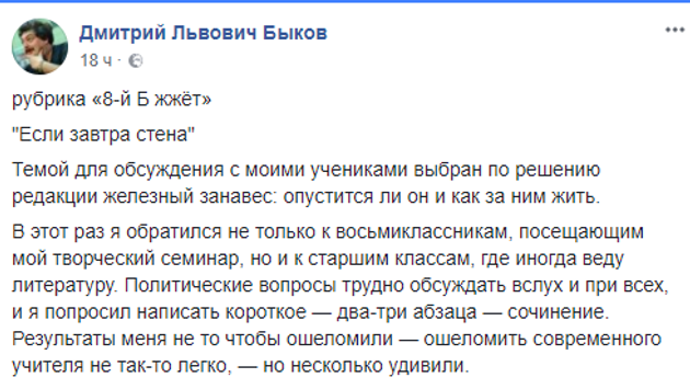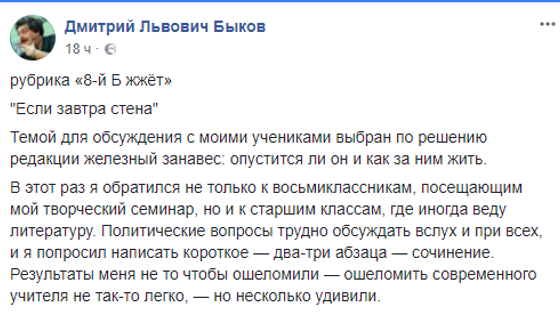 Писатель Дмитрий Быков спросил своих учеников, что они думают о возможности нового «железного занавеса», и удивился их ответам. Быков попросил своих учеников написать сочинения на тему «Если завтра стена». «Результаты меня не то чтобы ошеломили – ошеломить современного учителя не так-то легко, – но несколько удивили», – признался он. Писатель в своем Facebook привел выдержки из сочинений некоторых учеников. Большинство относятся спокойно к вероятности изоляции России от других стран. «Конечно, жаль, мы снова спрячемся в раковине, но тогда родится жемчужина. Обращение России к самой себе возродит уровень культуры и всего-всего. Я за занавесом выживу, страдать не буду. Мое будущее не обязано зависеть от Европы, Америки, Азии. Я настроена больше объективно патриотично, чем космополитично», – пишет 15-летняя Ника. «Разговоры про железный занавес мне довольно смешны. Я их слышу и дома иногда, и по телевизору, когда заходит речь про изоляцию. Люди, опомнитесь, стыдно! Какая изоляция, двадцать первый век! Все это смешно. Это можно представить как пугалку, но даже в Китае не получилось, и надо всех расстрелять, чтобы интернет перестали обходить», – считает 14-летний Андрей. «Для России железный занавес был временем особенного развития науки и культуры. Россия так устроена, что она лучше всего отвечает на вызовы. Мы не очень хорошо умеем жить обычной жизнью, но когда нам объявляют войну, мы быстро мобилизуемся. Я была несколько раз в Латвии, не на неделю, а на месяц, и я знаю, какая там дискриминация русских. Я знаю, как нас поучают с высокомерием. Мой дядя вернулся из Америки после семи лет эмиграции и больше никогда туда не ездит», – замечает 15-летняя Валентина.