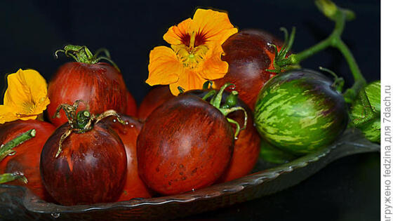 Сталь дамаска Сегодня у меня на обед очень вкусные и красивые помидорки, так и хочется сказать «нежные», хотя так про томаты, вроде, и не говорят… На тарелочке И имечко-то у них жесткое – «Сталь дамаска», а на вкус и не скажешь, что из «стали», хочется есть одними губами… Богатый, сладкий, приятный вкус. А может, за расцветку так назвали. Она у этого томата интересная, что ни день – разная. То сине-зеленая, то оранжевая, то малиновая, то они неоново-розово-красные с фиолетовыми и оранжевыми штрихами… Очень красив! В раннем возрасте они с сине-зелеными полосками и с синими плечами. Жду я зрелый и красивый, а он пока зелено-синий... А потом: Коллаж Томат Damascus Steel — новинка селекции 2015 года от Бреда Слейтера (США). Он крепкий, высокорослый, у меня созрел уже к середине июля. Плоды — сливки, массой до 80 граммов. Но у меня они скорее круглые, чем вытянутые. Среднее количество плодов в кисти: 5-6 штук. Можно его выращивать в ОГ, но я посадила в теплицу в конце апреля совсем крошкой. В лунку добавила удобрение длительного действия AVA, яичную скорлупу, костную муку, золу. Периодически мульчирую травкой. (Она быстро исчезает с поверхности и подкармливает растение). Томат «Дамаск стали» красивый, вкусный и урожайный. Буду сажать и в следующем году!