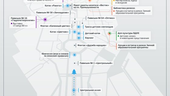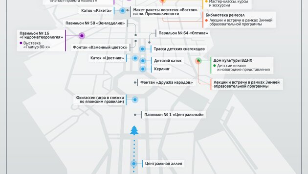 Подробный гид по зимним развлечениям на территории выставки. 30 ноября на ВДНХ открылся «Город зимы». Катки, тюбинговая горка, павильон «Керлинг» и площадка для зимней игры по японским правилам юкигассен ждут любителей свежего воздуха и острых ощущений. Mos.ru рассказывает, чем еще заняться в новом сезоне на территории главной выставки страны, где посмотреть спектакли, посетить лекции, мастер-классы и выставки. Сориентироваться среди множества вариантов поможет карта — берите ее на вооружение и отправляйтесь навстречу зиме. Город зимы: коньки, снежки и тюбы Центральная аллея ВДНХ превратилась в светящуюся реку, ведущую к главной елке. На ее берегах расположились новые катки, горки для катания и площадки для зимних игр. Между фонтанами «Дружба народов» и «Каменный цветок» открыт каток с искусственным покрытием «Цветник». Благодаря его площади — 4500 квадратных метров — здесь одновременно смогут кататься 1200 человек. «Цветник» — для семейного отдыха: оформленный в праздничной зимней стилистике, он станет площадкой для веселых зарядок и эстафет. Рядом с «Цветником» — детский каток. Здесь ждут самых маленьких посетителей — от трех до восьми лет, которые еще только учатся кататься. Уверенно стоять на коньках им помогут помощники фигуриста — специальные приспособления в виде вагончиков, на которые можно будет опереться и немножко отдохнуть. В этом году впервые в истории ВДНХ на коньках можно будет покататься на площади Промышленности — здесь появится большой каток «Ракета». Площадь искусственного льда составляет 8600 «квадратов», так что «Ракета» может одновременно принимать 2400 катающихся. Этот каток понравится молодежи: в течение зимы здесь планируют проводить костюмированные вечеринки и тематические дискотеки. И «Ракета», и «Цветник» будут работать каждый день, кроме понедельника. По будням покататься можно с 11:00 до 23:00, по выходным — с 10:00 до 23:00. Стоимость билетов на сеансы — от 150 рублей. Любителей экстремальных спусков ждет тюбинговая горка «Север» с пятью склонами и бугельным подъемником. Она расположилась справа от главного входа. Высота — семь метров, длина спуска — порядка 80. Любителей катания ждут 130 тюбов-«ватрушек». Специальные защитные шлемы можно взять в пункте проката рядом с горкой. Для тех, кто замерз, у склонов есть кафе. Также рядом находится медпункт. Горка «Север» ждет посетителей старше трех лет, дети, рост которых меньше 110 сантиметров, могут кататься только в сопровождении взрослых. Горка работает ежедневно: по будням — с 11:00 до 23:00, а по выходным и праздникам — с 10:00 до 23:00. Один спуск для взрослого стоит 50 рублей в будни и 70 рублей — в выходные и праздничные дни, для детей ростом до 140 сантиметров — 40 и 50 рублей соответственно. Подробнее о ценах — на сайте ВДНХ. Поклонникам зимних олимпийских видов спорта стоит держать курс на фонтан «Дружба народов». В теплом павильоне «Керлинг», расположенном прямо за ним, есть шесть дорожек, на которых можно попробовать свои силы: пять — для взрослых (10 метров на два метра) и одна — для детей (пять с половиной метров на два метра). Инвентарь для игры есть на каждой из них. Павильон работает ежедневно: по будням — с 11:00 до 23:00, по выходным и праздничным дням — с 10:00 до 23:00. На дорожках ждут игроков старше трех лет. С правилами игры и стоимостью аренды дорожки можно ознакомиться 