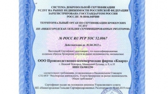В апреле 2019 года агентство недвижимости «Кварц» получило очередной сертификат Системы добровольной сертификации услуг на рынке недвижимости Российской Федерации, выданный Территориальным органом по сертификации брокерских услуг НГСР. В соглашении по сертификации подтверждается, что услуги агентства «Кварц» соответствуют требованиям Российской Гильдии Риэлторов. В ходе процедуры сертификации эксперты ТОС проверили все сферы деятельности агентства - от наличия офиса до финансово-экономических показателей деятельности. Как отметила директор АН «Кварц» Ирина Малыгина, «мы не сомневались в том, что получим очередной сертификат РГР - во-первых, потому, что одна из приоритетных целей нашего агентства - укрепление цивилизованного, прозрачного рынка риэлторских услуг Нижнего Новгорода, а во-вторых, буквально недавно мы переехали в новый, современный, высокотехнологичный офис площадью около 900 кв.м., где есть все необходимое для оказания услуг самого высокого качества. Работа в сертифицированном агентстве недвижимости обеспечивает надежность и безопасность и для новичков, и для опытных риэлторов - и потому, что деятельность ведется по продуманным, технологичным стандартам, и потому что ответственность агентства застрахована. Приходите работать к нам - научим, подскажем, поможем!»