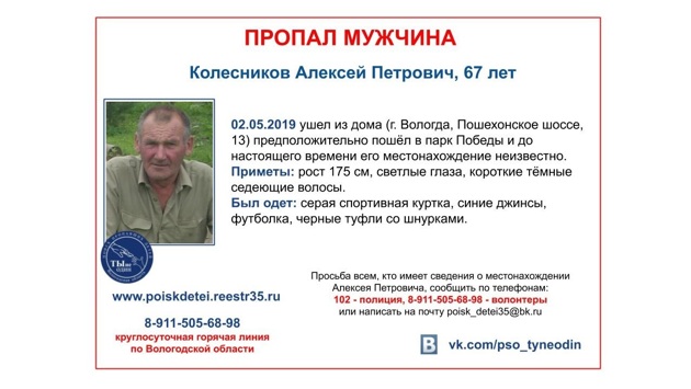 В областной столице разыскивают 67-летнего Алексея Колесникова. 2 мая он ушел из своего дома на Пошехонском шоссе и до настоящего времени его местонахождения неизвестно. Мужчину могли видеть в заречной части города, потому что по имеющейся информации он направился в парк Победы. Приметы: рост 175 см, светлые глаза, короткие темные седеющие волосы. Был одет в серую спортивную куртку, синие джинсы, футболку, черные туфли со шнурками. Всех, кто имеет сведения о местонахождении этого человека, просят сообщить по телефонам: 102 – полиция, 8-911-505-68-98 – круглосуточная горячая линия по Вологодской области, открытая волонтерами.
