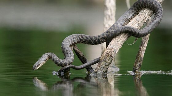 Станислав Шинкаренко, известный блогер, интересно и занимательно пишет про водяных ужей. Один и тот же разговор получается у меня каждый раз, как я выхожу на фотоохоту за водяными ужами: - Ты не боишься фотографировать гадюк? – спросил меня незнакомый голос. Будь внимательным, а то она может укусить. - Да нет, ужа, - сказал я, продолжая снимать уже не первый на сегодня крупный план. - Учти, гадюки могут скрещиваться с ужами. А потом на свет появляются очень ядовитые особи серого, черного цвета. А иногда встречаются даже в клеточку. Водяной уж: особенности внешнего вида Важно понимать, что водяной уж не является ядовитой змеей. При этом у него нет пятнышек на голове желто-оранжевого цвета, как у обыкновенного ужа. Для людей уж водяной абсолютно безопасен. Вонючие испражнения и пронзительное шипение и вот и весь арсенал его защитных средств. В отличие от обыкновенного, водяной уж не способен делать "мертвый" вид. Рацион питания ужей водяных состоит в основном из рыбы (окунь, плотва, вьюн и др.), редко жабы и головастики. Пресмыкающиеся ловят добычу под водой, а питаются ею всегда на суше. Если улов слишком крупный, ее поедание может продолжаться целый час или даже больше. Про водяных ужей нам рассказал кандидат биологических наук, работник Волгоградского университета, герпетолог Дмитрий Гордеев: «Водяных ужей можно встретить во многих местах нашей планеты: начиная от юго-западной части Франции, северной Африки (ее восточная часть) и заканчивая Персидским (Арабским) заливом, северо-западной частью Китайского государства». По параметрам длины самки ужа водяного преобладают над самцами. Женские особи могут достигать 1,1 метра. У водяных ужей активный жизненный период продолжается практически 9 месяцев. Уже в октябре эти пресмыкающиеся уходят на зимовку, а вылазят из своих укрытий в апреле месяце. Далее в их жизненном цикле наступает важный период спаривания. К слову, одна самка водяного ужа способна отложить от 4 до 20 яиц. Водяной уж и гадюка: как не спутать Рисунок на спине водяных ужей похож на зигзагоподобную полосу на теле гадюки. Это признак, по которому многие приравнивают водяного ужа к ядовитой гадюке. Чтобы разобраться, кто же перед вами водяной уж или гадюка, рассмотрите такие детали: Зрачки (у гадюки вертикальные, а водяного ужа круглые) Форма головы (у гадюки треугольная, у водяного ужа овальная) Чешуйки на голове (у гадюки мелкие, а водяного ужа крупные) Длина особей (гадюка максимум до 0,73 м, водяной уж до 1,1 м) Помните: водяные ужи не несут угрозу для человека. Не уничтожайте их!