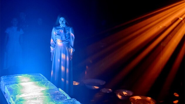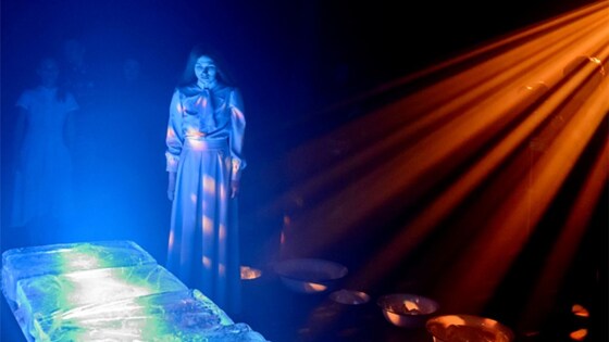 Авторы спектакля, композитор Алексей Сюмак и режиссёр Марина Брусникина сразу обозначили направление драматургической задачи – "Мороз, красный нос" на стихи Н. А. Некрасова – это не новогодняя сказка, а серьёзный разговор о смерти", разговор о феномене, которым интересуется человек через самые различные формы и проявления рефлексии – от искусства и религии до науки. Это продолжение основной музыкальной традиции, неважно, идёт она от "Зимнего пути" или "Лесного царя" Шуберта или же от философских размышлений симфоний Малера. Плюс ко всему, Некрасов, разумеется, вносит свою маканинскую специфику – умирают не только главные герои, но и все остальные, хотя и несколько позже. Вообще говоря, в несколько нетипичной ситуации этого спектакля, необходимо понять, по каким параметрам и по законам какого жанра анализировать то, что состоялось в театре под названием "Мороз, Красный нос". Постановщики позиционируют его как камерную оперу и, вероятнее всего, это наиболее очевидный, хотя и не абсолютный критерий. Фото: Александр Куров Но при этом следует принимать во внимание, что первичным в этой постановке стал текст Некрасова. Об этом в разных интервью неоднократно говорила Марина Брусникина, в том числе и то, что она видела некрасовский текст именно как основу для оперы. И то, что для работы над этим проектом был приглашён Алексей Сюмак, есть проявление какой-то высшей формы художественной справедливости, поскольку именно он фантастически органичен в этом замысле. И эта органичность вытекает из его предыдущей заметной работы – оперы “Cantos”, основанной на текстах Эзры Паунда. Я честно признаюсь, что не готов разделить с авторами спектакля восхищение поэзией Некрасова. Как бы ни относиться к этим двум крайне несимпатичным персонам, с текстами которых имеет дело Алексей Сюмак, приходится признать, что Эзра Паунд всё же представляет собой явление мировой культуры в отличие от приусадебного графомана, отягощённого самой унылой формой депрессии. Тем более интригующим стало ожидание того, каким образом в опере или, если угодно, спектакле, будут воплощены поэтические миры Некрасова. Хотя с самого начала можно было предположить, экстраполируя уже известные особенности композиторского письма А. Сюмака, что основное внимание будет уделено вокальной и хоровой стороне музыкального языка произведения. Фото: Александр Куров Спектакль выстроен таким образом, что зритель до некоторой степени оказывается внутри "рабочего поля" спектакля, при этом оставаясь в положении достаточно отстранённом – он никак не задействован, и всё действие как бы обтекает его со всех сторон. Спектакль начинается совершенно незаметно, я бы сказал, мастерски незаметно. Среди зрителей, только что сдавших верхнюю одежду в гардероб начинают по одной появляться зябкие женские и детские фигурки, одетые в платье в голубых тонах. Они перемещаются как зомби и греют руки. Поначалу, когда это одна или две фигуры, это воспринимается как случайность, чуть позже ты понимаешь, что уже находишься внутри спектакля. Они равномерно распространяются среди зрителей и уже через короткое время ты с разных сторон слышишь постукивания ломиком о мёрзлую землю – звуки, не требующие комментариев. Это символ совершенно однозначного ассоциативного ряда. Это звук, знакомый в наших краях от Москвы д