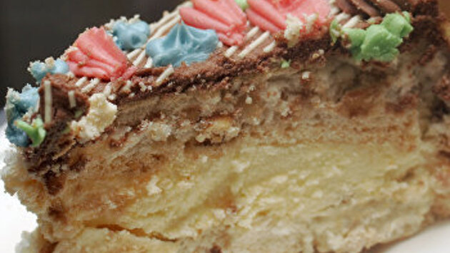 Торт «Киевский» — продукция совершенно советская. Массовая и индустриальная. Хотя — нет. На самом деле всё началось довольно давно — в конце XIX века. В 1883 году неподалеку от Демеевского сахарорафинадного завода купцом Валентином Ефимовым была основана «Демеевская паровая фабрика шоколада и конфет». Располагалась фабрика там, где и сейчас находится Киевская кондитерская фабрика — на хуторе Демеевка (присоединён к Киеву в 1918 году — при гетмане). Кстати, название местности неопределённое — одни пишут Демеевка, другие — Дамиевка, третьи предпочитают послевоенное название «Сталинка». Объём производства фабрики достигал около 200 тонн в год. На ней производились шоколад, драже, конфеты, карамель, мармелад, пастила, варенье, пряники, чайное печенье. ТМ «Валентин Ефимов» сохранилась даже после того, как сам Ефимов был отстранён от руководства. В 1920 году фабрика была национализирована, а в 1923 году она получила имя Карла Маркса. В 1994 году фабрика приватизирована, а в 1996 вошла в состав концерна «Укрпромпостач» Петра Порошенко. В 2010 году имя классика из её названия исчезло, и она стала киевской кондитерской фабрикой «Рошен». Памятник Марксу на территории фабрики был снесён только в 2016 году — после неоднократных требований Института национальной памяти (Порошенко почему-то считал законодательство о декоммунизации необязательным для себя лично). В СССР (во всяком случае — в послевоенном СССР) киевская фабрика им. Карла Маркса специализировалась на тортах. Наиболее популярным киевским тортом был, разумеется, «Киевский». Цех готовой продукции Киевской кондитерской фабрики. 1986 г. Торт этот появился в 1956 году (называют, впрочем, и другие даты — 1953 и 1957 годы) и, по распространённой легенде, появился в результате ошибки кондитера. Якобы однажды подготовленную для изготовления бисквита партию взбитого яичного белка забыли вовремя спрятать в холодильник. Следующая смена, которую возглавлял начальник бисквитного цеха Константин Петренко, решила соорудить торт из застывших белков. Получился шедевр. Как и многие из такого рода мифов, этот не совсем правдив. Никакой случайности не было, кондитеры несколько лет искали свой собственный рецепт бисквита, и его специфика определяется не только хранением. Запатентовали изобретение в 1973 году. Тогда госкомитет Совмина по делам изобретений и открытий выдал авторское свидетельство кондитерам фабрики имени Карла Маркса Анне Курило и Галине Фастовец-Калиновской. «Киевский» торт давно уже производится на десятках предприятий разных стран, но традиционно считается, что «правильная» рецептура принадлежит только технологам «Рошена». Последнее представляется сомнительным, поскольку она была стандартизирована в 1977 году. Что до остальных составляющих рецептуры, то они постоянно менялись. Например, кремовые украшения в виде шоколадных узоров, цветов и листьев каштана появились довольно поздно — в 1970-е годы. До стандартизации каждый мастер украшал торт по-своему. Кстати, существует легенда, что рисунок был элементом защиты от подделок. В Москве «Киевский» торт украшен берёзками, что само по себе смотрится смешно — ведь символ Киева — именно каштан… Орехи в составе тоже постоянно менялись. Изначально использовали экзотический кешью, но позже вместо него стали добавлять фундук или арахис. Первоначаль