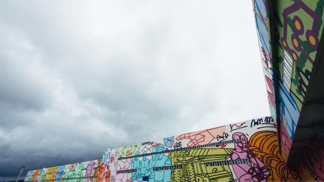Эрик Булатов вместе с женой Наташей приехал из Парижа лично представить свое самое большое произведение «Стой — иди. Амбар в Нормандии» местной публике и столичным гостям. 87-летнего художника переправили в затерянный среди муромских лесов город, как волшебника из советской песни, в голубом вертолете. В роли 500 эскимо выступила гигантская фреска (она же мурал, как любят говорить стрит-артисты), которую по эскизу художника 20 дней исполняли 6 ассистентов. Она представляет собой контаминацию двух работ — «Стой — иди» (1974) и «Амбар в Нормандии» (2013). В данном случае это искусство не столько уличное, сколько заводское: композиция площадью 2,5 тыс. кв. м заняла фасад трубоэлектросварочного цеха Выксунского металлургического завода, входящего в корпорацию ОМК. Благотворительный фонд «ОМК-Участие» и президент его попечительского совета Ирина Седых уже десять лет проводят в городе фестиваль современного искусства «Арт-овраг», благодаря которому в Выксе появились десятки граффити известных художников на стенах пятиэтажек, арт-дворы, благоустроенные современными урбанистами, парковые беседки, павильоны и арт-объекты в духе Никола-Ленивца (Юлия Бычкова и Антон Кочуркин, рулящие «Архстоянием» в Калужской области, три года были кураторами «Арт-оврага»). Среди деревьев сквера «Лесопосадка» светит и днем и ночью успевший стать культовым объект Тимофея Ради «Это не сон». Горожане наслаждаются новой набережной вокруг огромного пруда и реконструированным «Пятаком» — бывшей танцплощадкой в парке, служащей теперь и катком, и эстрадой, и просто приятным местом. Год назад было заявлено о создании Индустриального стрит-арт-парка на территории завода. Булатовский шедевр стал третьим его экспонатом. До этого два цеха расписали Миша Most и Алексей Лука, и циклопические размеры произведений сами по себе делают их раритетами. Организаторы рапортуют о художественных достижениях как о производственных рекордах: «Для реализации замысла потребовалось 400 литров краски, 678 аэрозольных баллонов, 4 подъемника, а также сотни формальных согласований и сражение с погодными препятствиями». На заводе работает 18 тыс. человек (из 50 тыс. населения Выксы), так что зрителями парк уже обеспечен по определению. Однако новый артистический директор Выксунского фестиваля Федор Павлов-Андреевич на этом останавливаться не захотел. Известный гений пиара (и художник-перформансист) сделал ставку на знаменитостей — ему принадлежит идея позвать международную звезду Эрика Булатова и пригласить в Выксу беспрецедентный пул московских «селебов». По замыслу арт-директора, столичные гости должны были не только осмотреть достопримечательности и поаплодировать знаменитому художнику, но и познакомиться с местным населением. Прогулка по городу стала перформансом в жанре «хождение в народ»: на каждой точке маршрута гостей поджидал какой-нибудь герой, рассказывающий о жизни в Выксе. Там были депутат местного совета, потомок династии металлургов, кузнец-байкер, юный скейтбордист и Лена Садикова, мать четверых детей, блогер, прославившаяся участием в телешоу и тем, что похудела прямо на экране на 70 кг. Для нее был подготовлен сюрприз — встреча с живым телеведущим Андреем Малаховым (впрочем, она уже была с ним до этого знакома). Но главный перформанс — «Машинная рапсодия» — был исп