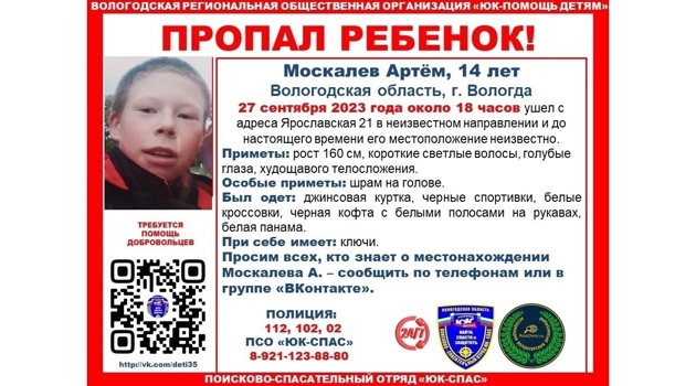 В Вологде пропал 14-летний Артём Москалев