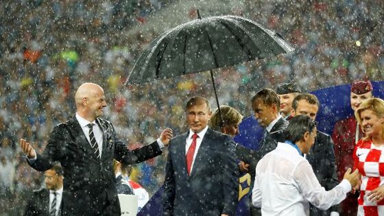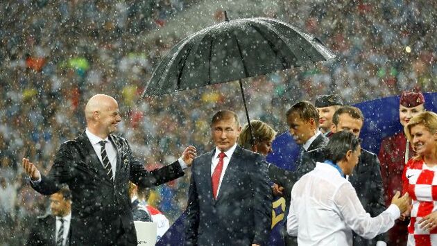Британский таблоид The Sun сообщает, что во время награждения чемпионов мира по футболу президент РФ Владимир Путин «счастливо стоял под зонтиком», а французский и хорватский лидеры мокли под дождем.