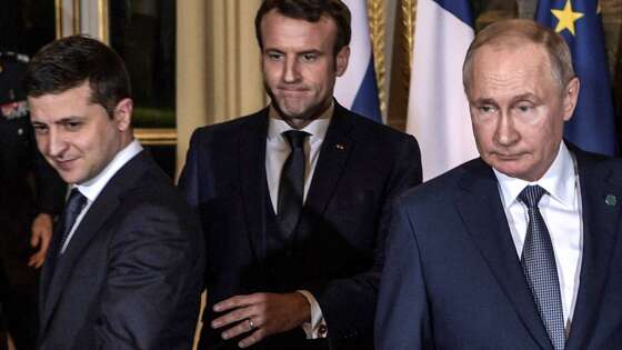 Песков рассказал, что во время общения Путина и Зеленского тет-а-тет к ним зашел французский лидер Эммануэль Макрон, который их прервал и настоял, чтобы далее общение продолжалось в "нормандском формате".