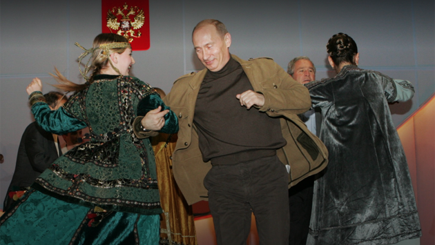 «Танец был настолько зажигательным, что Владимир Путин и Джордж Буш не сдержались и присоединились к артистам на сцене», — сказано в подписи к видео, на котором Путин и Буш-младший танцуют под народную песню «Барыня, барыня, сударыня барыня».