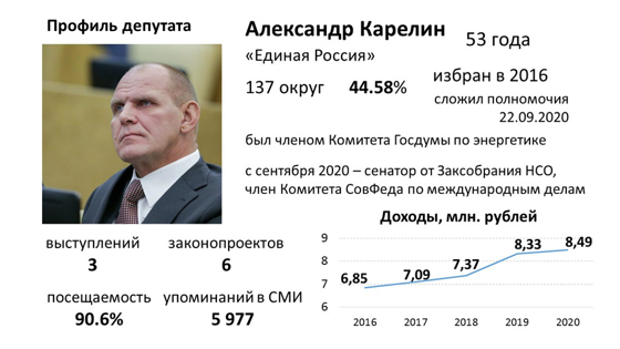 В сентябре 2020 года Александр Карелин сложил полномочия депутата Госдумы и стал сенатором от Заксобрания Новосибирской области. Для этого в целях соблюдения формальной процедуры назначения в Совет Федерации он избрался в Заксобрание по списку «Единой России». Примечательно, что впоследствии мандат Карелина в Заксобрании получил миллиардер Павел Кива, который за 2020 год задекларировал 1,5 млрд рублей дохода.