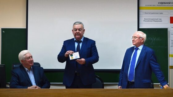 Председатель Пензенского облсуда Виктор Трифонов и председатель регионального совета судей Вячеслав Судариков поздравили с юбилеем Виктора Терехина, председателя Пензенского облсуда в почётной отставке, кандидата юридических наук, заведующего кафедрой «Правосудие» юридического института Пензенского госуниверситета. «Вся Ваша жизнь и трудовая деятельность – образец высокого патриотизма и преданности единожды выбранной профессии судьи. Будучи в почётной отставке, Вы продолжаете заниматься юридической наукой, обучаете будущих юристов. Ваши ученики уже стали судьями и достойно служат правосудию, продолжая заложенные Вами традиции. Подтверждением Вашего непререкаемого авторитета являются присвоенные Вам звания Заслуженного юриста РФ, Заслуженного юриста Пензенской области и многочисленные почётные награды», — сказал Виктор Трифонов, обращаясь к юбиляру. В ходе торжественного мероприятия Виктору Терехину была вручена медаль «20 лет мировой юстиции Российской Федерации». Вспоминая годы работы в Пензенском облсуде, Виктор Терехин отметил: «В Пензенский областной суд я пришел в статусе заместителя председателя суда и был третьим по счету замом. Передо мной была поставлена основная задача – подготовка суда к рассмотрению уголовных дел с участием присяжных заседателей. Мы готовили судей, аппарат суда, оборудовали служебные помещения и залы судебных заседаний. Организационные вопросы по введению суда присяжных заняли ни один год, была проделана значительная работа, что позволило на достаточно высоком уровне в 2003 г. провести первый процесс с участием присяжных заседателей. Надо отметить, что этот удачный опыт позволил и в дальнейшем качественно рассматривать такие дела. В последующие годы никаких проблем с судами присяжных не возникало».