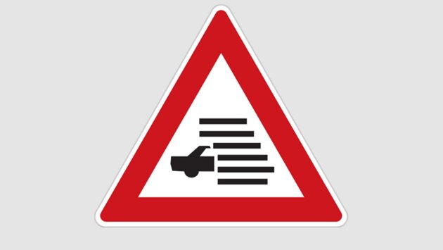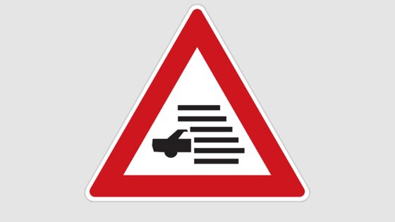 Первый необычный знак представлен в виде треугольника с красной окантовкой, а внутри изображена часть автомобиля, которая переходит в параллельные полосы. Такой указатель применяется в Швеции и обозначает возможное образование тумана на дороге.