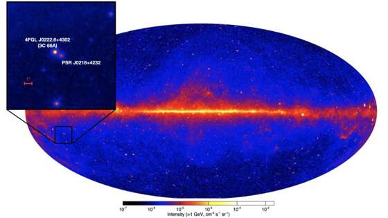 Анализируя данные, собранные при помощи космической обсерватории Fermi («Ферми») НАСА и детектора Major Atmospheric Gamma Imaging Cherenkov (MAGIC), международная команда астрономов изучила миллисекундный пульсар, известный как PSR J0218+4232. Результаты этого исследования позволяют глубже понять излучение со стороны этого источника.<br>Пульсары представляют собой вращающиеся нейтронные звезды с мощным магнитным полем, испускающие потоки электромагнитного излучения. Наиболее быстро вращающиеся пульсары, период собственного вращения которых составляет менее 30 миллисекунд, известны как миллисекундные пульсары. Астрономы полагают, что объекты этого класса формировались в двойных системах, когда изначально более массивная компонента превращалась в нейтронную звезду, скорость вращения которой затем постепенно возрастала за счет аккреции материи со стороны второй звезды.<br>Источник PSR J0218+4232 (или сокращенно J0218), находящийся на расстоянии около 10 270 световых лет от Земли, представляет собой миллисекундный пульсар с периодом вращения в 2,3 миллисекунды. Он движется по общей орбите с периодом в двое суток со звездой-компаньоном – белым карликом массой около 0,2 массы Солнца. Объект J0218 имеет экстремально мощное магнитное поле индукцией примерно в 100 000 гауссов. Более того, его характеристический возраст составляет примерно 500 миллионов лет, а мощность электромагнитного излучения, выделяемая за счет замедления вращения, эквивалентна приблизительно 240 дециллионов эргов в секунду, что делает его одним из самых молодых и высокоэнергетических миллисекундных пульсаров, известных на настоящее время.<br>Предыдущие исследования объекта J0218 указывали на то, что он может являться одним из лучших кандидатов для поиска гамма-излучения сверхвысоких энергий (энергией выше 100 гигаэлектронвольт). Поэтому команда астрономов под руководством Пабло М. Сэз Паркинсона (Pablo M. Saz Parkinson) из Калифорнийского университета в Санта-Круз, США, проанализировала многолетние данные наблюдений источника J0218, проводимых при помощи обсерваторий Fermi и MAGIC НАСА.<br>Анализ данных наблюдений показал наличие пульсирующего излучения с энергией выше 25 гигаэлектронвольт со стороны источника J0218, но полное отсутствие излучения с энергией выше 100 гигаэлектронвольт. Проведя многосторонний анализ полученных результатов с использованием компьютерного моделирования, авторы работы пришли к выводу, что обнаружение гамма-излучения сверхвысоких энергий со стороны источника J0218 при помощи детекторов текущего поколения, таких как Fermi и MAGIC, является затруднительным. Ситуация может измениться с введением в эксплуатацию обсерваторий нового поколения, таких как Cherenkov Telescope Array (CTA), запуск которой состоится уже в 2022 г., указывают авторы.<br>Исследование представлено на arxiv.org.