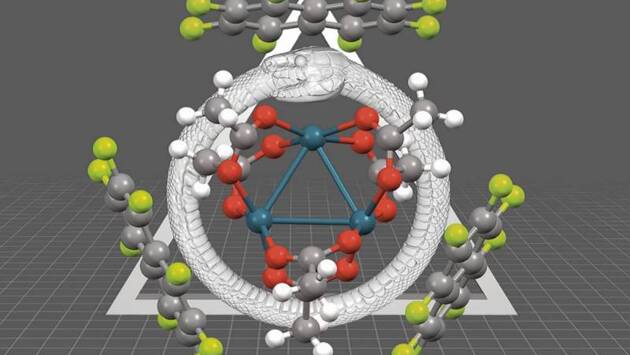 Идея изобразить уробороса (змею, поедающую собственный хвост) была предложена авторами научной статьи. Уроборос у представителей естественных наук ассоциируется с органической химией и даже является частью герба Института химии СПбГУ. Это связано с легендой, что немецкий ученый Фридрих Август Кекуле во сне увидел змею, поедающую собственный хвост. И этот образ натолкнул его на мысль о циклической формуле бензола — одного из основополагающих соединений органической химии. В свою очередь, треугольник (символизирующий треугольный кластер палладия) как неживая форма создает контраст с органической формой змеи и соотносится со структурой химического соединения неорганической химии.