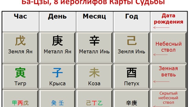 Карта Ба Цзы — это таблица из восьми иероглифов. Она рассчитывается на основе даты и времени рождения человека. Поклонники практики полагают, что таблица показывает врожденные «настройки» или качества личности. А еще помогает выяснить, какие даты будут наиболее благоприятными для каких-либо дел: переезда, смены работы, брака, начала диеты и так далее.
