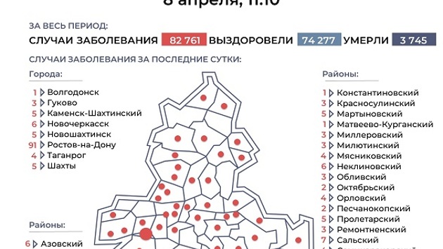 Ростовская область, 8 апреля 2021. DON24.RU. В 43 муниципалитетах Ростовской области выявлены новые случаи заражения COVID-19 за минувшие сутки, сообщается на сайте донского правительства. Так, 91 случай заболевания зафиксирован в Ростове-на-Дону. По сравнению со вчерашним днем в донской столице отмечается небольшое снижение числа заболевших. Напомним, днем ранее коронавирус обнаружился у 99 горожан. В числе антилидеров сегодня Зерноградский район с 10 новыми зараженными и Сальский, где выявлено семь инфицированных. Кроме того, новые случаи зарегистрированы в Новочеркасске, Азовском, Багаевском и Неклиновском районах - по шесть заболевших. На одного меньше в Каменске-Шахтинском, Новошахтинске, Шахтах, Белокалитвинском, Мартыновском и Пролетарском районах. Еще четыре случая - в Таганроге, Аксайском, Заветинском, Мясниковском, Орловском, Семикаракорском, Тарасовском и Цимлянском районах. По три - в Гукове, Кашарском, Красносулинском, Миллеровском, Милютинском, Обливском, Ремонтненском и Целинском. По два - в Волгодонском, Дубовском, Зимовниковском, Каменском, Октябрьском, Песчанокопском, Тацинском районах. По одному - в Волгодонске, Верхнедонском, Константиновском, Матвеево-Курганском, Советском, Усть-Донецком, Шолоховском районах. Общее число инфицированных на Дону составило на сегодня 82 761. Из них 74 277 выздоровели. Стационарное лечение продолжают 1926 пациентов. Койки в ковидных лечебницах заполнены на 75,9%. За сутки от ковида умерли 26 человек. Добавим, что впервые новая коронавирусная инфекция в регионе была зафиксирована 25 марта 2020 года. Ранее донские власти сообщили, что готовы вдвое увеличить число пунктов вакцинации от COVID-19.