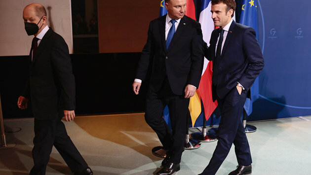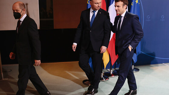 Страны так называемого Веймарского треугольника - сформированной в начале 90-х годов политической платформы Франции, Германии и Польши - выступили за начало предметного диалога с Россией по проблемам европейской безопасности. Встретившись в Берлине, канцлер ФРГ Олаф Шольц, а также президенты Франции и Польши Эмманюэль Макрон и Анджей Дуда с оглядкой на нарастающую в Европе нервозность среди своих избирателей из-за кризиса вокруг Украины констатировали "готовность к конструктивному участию в предметных и ориентированных на результат" переговорах с Москвой по вопросам, представляющим взаимный интерес.