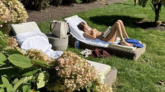 На размещенном кадре манекенщица позировала, лежа в черных трусах в установленном на газоне шезлонге. Одной рукой она держала книгу, а второй прикрывала обнаженную грудь.