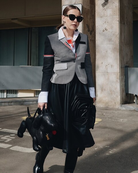 Ксения Собчак позировала в сером жакете с черными рукавами, кожаной юбке-миди с цветами, высоких сапогах, солнцезащитных очках и серьгах. Журналистка дополнила образ черной кожаной сумкой в виде таксы бренда Thom Browne. Стоимость аксессуара на официальном сайте марки составляет $3970 (более 325 тысяч рублей — прим. ред.). Поклонники оценили сумку звезды.